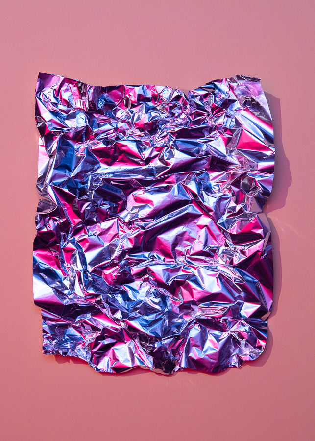 “Metalcolor” is a visual investigation in which an everyday material becomes a territory of abstraction and light. In this series, metallic paper leaves behind its ordinary function and transforms into a living surface: a topography of folds, tensions, and traces that both captures and distorts its surroundings.